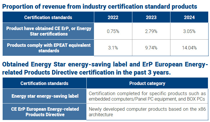 Hardware: Continuing previous energy-saving targets, design internal regulation standards were officially adopted in new standard products with X86 architecture in 2024. Cer tain products are designed in alignment with Energy Star standards standard, serving as benchmark models that deliver greater carbon reduction benefits and progressively enhance overall emission reduction performance.