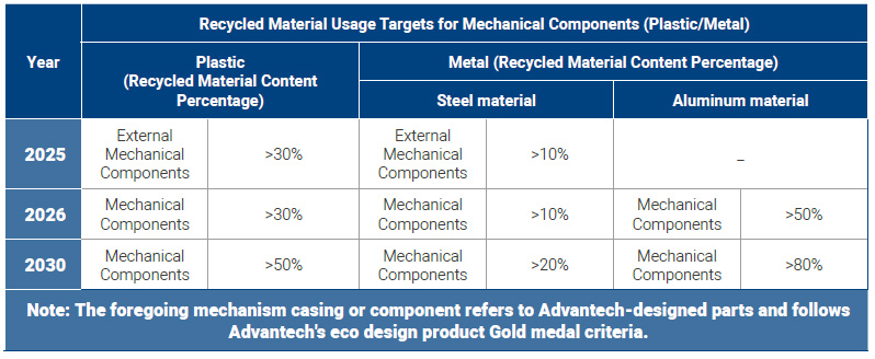 In the third quarter of 2024, Advantech launched the sustainable raw material project to evaluate the use of recycled materials by tracing the source of raw materials. Moreover, recycled materials were introduced to major business groups to conduct the pilot production plan. The project extends into the first quarter of 2025, and it has successfully achieved its phase goals, including compiling statistics on raw material traceability, evaluating the effectiveness of trial integration of recycled materials into product structural components, and drafting preliminary targets for future implementation. In terms of raw material traceability, considering the characteristics of Advantech's products, we prioritize the top three raw materials by usage volume for implementing control: plastics, steel/iron, and aluminum. These three recycled materials were introduced to the sustainable raw materials pilot program. Furthermore, in addition to managing product structural components, we also conducted a traceability survey for packaging materials. Currently, the implementation outcomes of recycled material usage ratios, categorized by product type, are detailed in Figure.