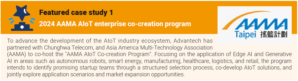 Asia America Multi-Technology Association (AAMA) | Smart manufacturing, smart healthcare, smart environmental protection, smart logistics | In partnership with Chunghwa Telecom, 11 startups were recruited through industry-specific proposals and counseling, with co-creation solutions actively explored in collaboration with five of them. | |