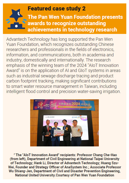 In terms of positive impact, Advantech leverages to apply its core business strengths, guided by ecosystem partnerships and a spirit of co-creation, to promote an intelligent and sustainable planet. In terms of society, IoT is applied to telemedicine and healthcare to reduce medical costs and improve medical precision. In terms of the economy, improvements in the efficiency and performance of production, along with the application of AI technology, significantly elevate industrial productivity. In terms of the environment, equipment monitoring and the deployment of a large number of sensor will effectively reduce energy consumption and environmental pollution. In recent years, due to the development of alternative energy, Advantech has also ventured into the business of charging piles and alternative energy. Through close collaboration with customers and ecosystem partners to achieve sustainability in various fields. |