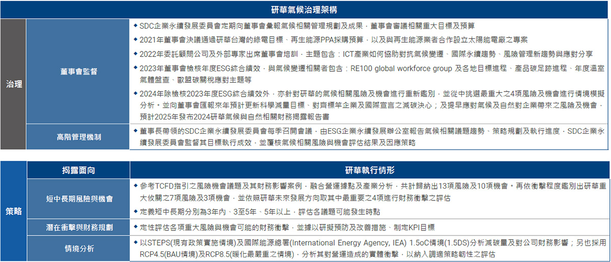 氣候變遷造成的極端氣候事件、各國積極的減碳目標所帶來低碳轉型壓力,以及來自價值鏈上下游的減碳要求,導致企業已面臨潛在的營運衝擊。因應全球逐步強化辨識氣候風險與財務影響連結性之需求,研華導入「氣候相關財務揭露架構」(Task Force on Climate-related Financial Disclosures,簡稱 TCFD),依照 TCFD 指引建議之氣候治理、策略、風險管理和關鍵指標四大核心元素推動氣候變遷管理與揭露,以系統化作法衡量公司面臨之氣候風險與機會,深入評估既有風險管理程序於泛營運風險地圖中關注的氣候變遷風險,評估結果及因應計畫彙報予 SDC 企業永續發展委員會,並由 SDC 企業永續發展委員會定期向董事會報告氣候管理進展,藉以提升企業因應氣候風險之韌性,詳細氣候風險與機會揭露及管理行動請參考「2024 研華氣候與自然相關財務揭露報告書」。