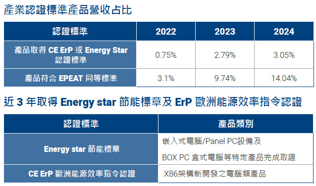 硬體 : 延續過去節能導入目標,2024 年正式以 X86 架構標準新產品導入設計內規標準,特定產品以 Energy Star 為設計目標作為更具減碳效益的示範標竿產品,逐步提升減碳績效。