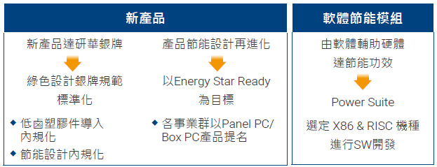 - 建置研華節能設計、綠色物料 ( 低鹵要求 ) 內部規範,以有效提升綠色產品覆蓋率