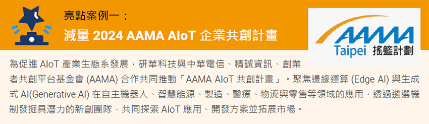 AAMA 創業者共創平台基金會 | 智慧製造、智慧醫療、智慧環保、智慧物流 | 與中華電信合作,以產業命題與輔導方式招募共11家新創公司,並實際與5家公司進行共創方案的探討。 | |