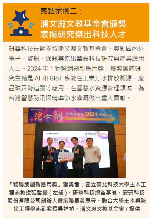 潘文淵物聯網創新應用獎 | 工業物聯網 | 共招募8隊物聯網應用之新創/學校團隊,並實際遴選出物聯網農業應用之創新團隊,以獎金、產業業師實際輔導該技術產業化應用。 | |